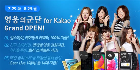 넥슨은 영웅의 군단 홍보모델로 인기 걸그룹 ‘걸스데이’에 이어 ‘에이핑크’를 발탁하고 29일 신규 광고 영상을 공개했다. 이번 광고 영상은 ‘영군, 너 하나면 충분해!’라는 슬로건을 중심으로 ‘에이핑크’ 여섯 멤버들이 다양한 재미요소를 통해 ‘영웅의 군단’을 즐기는 모습을 담고 있다.새로운 홍보모델 공개를 기념해 별도 공지 시까지 20레벨을 달성한 유저에게는 ‘걸스데이 티켓’을, 30레벨을 달성할 경우 ‘에이핑크 티켓 교환권’을 각각 선물한다.이와 함께 29일부터 8월 11일까지 특정 시간에 접속하는 유저에게는 게임 아이템과 함께 추첨을 통해 매일 1명씩 총 14명에게 스마트워치 삼성 기어 라이브를 선물한다.보다 자세한 내용은 공식 카페(//cafe.naver.com/lohkakao)를 통해 확인할 수 있다.조유진 기자 tint@asiae.co.kr<ⓒ세계를 보는 창 경제를 보는 눈, 아시아경제(www.asiae.co.kr) 무단전재 배포금지>