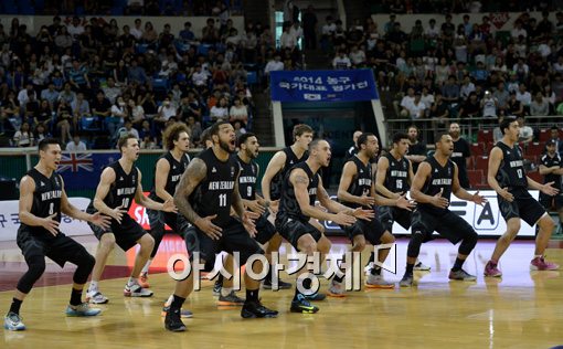[아시아경제 김현민 기자] 29일 서울 잠실학생체육관에서 열린 남자 농구 국가대표팀과 뉴질랜드의 1차 평가전에서 뉴질랜드 선수들이 전통춤을 선보이고 있다.김현민 기자 kimhyun81@asiae.co.kr<ⓒ세계를 보는 창 경제를 보는 눈, 아시아경제(www.asiae.co.kr) 무단전재 배포금지>