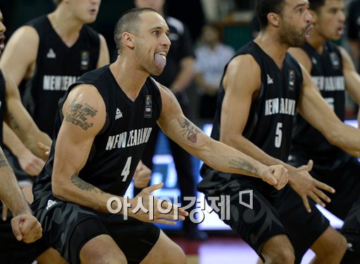 [아시아경제 김현민 기자] 29일 서울 잠실학생체육관에서 열린 남자 농구 국가대표팀과 뉴질랜드의 1차 평가전에서 뉴질랜드 선수들이 전통춤을 선보이고 있다.김현민 기자 kimhyun81@asiae.co.kr<ⓒ세계를 보는 창 경제를 보는 눈, 아시아경제(www.asiae.co.kr) 무단전재 배포금지>
