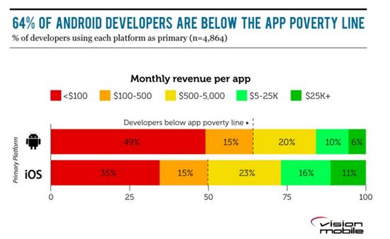 [아시아경제 조유진 기자] 애플리케이션 시장에 빈부 격차가 심화되고 있는 것으로 나타났다. 30일 미국 시장조사기관 업체 비전모바일이 발표한 2014년 3분기 개발자 경제 보고서에 따르면 앱 시장 규모는 매년 성장한 반면 앱 개발에 따른 수익은 특정 개발자에게 편중된 것으로 조사됐다. 월 소득이 500달러(약 51만원)에 미치지 못하는 소위 '앱 빈곤층'이라 불리는 개발자는 iOS 개발자의 절반, 안드로이드 개발자의 64%에 육박한 것으로 나타났다. 월 소득 50만달러(약 5억원) 이상을 버는 고소득 개발자는 상위 1.6%에만 편중되는 등 앱 시장에 빈부격차가 심화된 것으로 나타났다. 보고서는 앱 개발을 부업으로 하는 개발자를 제외하고도 60~70%의 개발자는 장기적으로 앱 개발·운영을 유지할 수 없을 것이라고 전망했다.조유진 기자 tint@asiae.co.kr<ⓒ세계를 보는 창 경제를 보는 눈, 아시아경제(www.asiae.co.kr) 무단전재 배포금지>