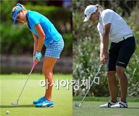 퍼팅 때도 장갑을 벗지 않는 렉시 톰슨과 모든 샷을 맨손으로 하는 캐서린 커크. 사진=Getty images/멀티비츠