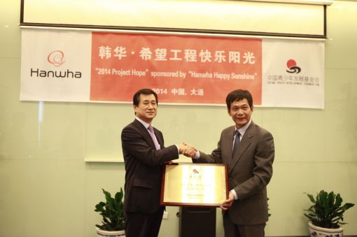 남성우 한화솔라원 대표와 투멍 중국청소년발전기금회 비서장은 29일 중국 베이징 중국청소년발전기금회 회의실에서 ‘한화?희망공정 해피선샤인’ 협약식을 가졌다. 한화그룹은 칭하이성 다퉁현 지역의 시에거우샹 희망학교에 30kW 규모의 지붕형(Roof-Top) 태양광 발전설비를 기증하기로 했다.