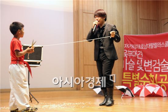 호남대학교 광산구어린이급식관리지원센터(센터장 양은주 교수)는 최근 광산캠퍼스 상하관 소강당에서 어린이들의 균형 잡힌 식습관을 유도하기 위한 ‘어린이 집합교육’을 실시했다. <br /> <br /> 8세 이상 어린이 300여명을 대상으로 실시된 이번 교육은 ‘골고루 먹어요’를 주제로 균형 잡힌 식사를 통한 올바른 성장에 관한 내용으로 진행됐다.<br /> <br /> 또 호남대랄랄라스쿨(단장 정영기)과 호남대 공자학원(원장 이정식)이 중국 교육부의 지원을 받아 특별순회공연 중인 ‘중국 마술·변검술 공연’도 펼쳐져 아이들의 큰 인기를 끌었다. <br /> <br /> 광주광역시 광산구어린이급식관리지원센터를 운영하고 있는 호남대 식품영양학과는 ‘건강한 어린이는 우리의 미래’라는 핵심가치 실현을 위해 위생적이고 안전한 어린이 단체급식 환경을 조성하고 영양적으로 균형 잡힌 급식을 제공하기 위해 노력하고 있다. <br /> <br /> 또 위생과 영양의 중요성에 대한 교육과 함께 어린이 단체급식의 질적 향상을 위한 기술지원에 최선을 다하고 있다.