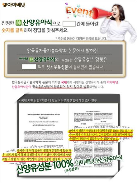 [아시아경제 장인서 기자] 산양분유 전문기업 아이배냇은 최근 발표된 논문을 통해 국내 산양분유 중 '純(순)산양유아식'만이 젖소우유 성분이 일체 들어있지 않음이 밝혀짐에 따라 이를 기념하는 퀴즈 이벤트를 진행한다고 30일 밝혔다.다음 달 17일까지 진행되는 이벤트에서는 아이배냇 순산양유아식의 산양유성분 함량을 맞추는 고객 총 54명을 선밸해 백화점상품권 30만원권 등 다양한 상품이 제공된다. 자세한 사항은 아이배냇 홈이지(//www.ivenet.co.kr/)에서 확인할 수 있다.아이배냇 순산양유아식은 한국유가공기술과학회에 수록된 '국내 시판 산양유제품 내 젖소 유성분의 혼입에 대한 조사 연구' 논문에 의하면 국내에 유통되고 있는 4개 회사 산양분유 제품 중 유일하게 젖소우유성분이 함유되어 있지 않은 것으로 검증됐다. 삼육대학교 동물자원학과 한경식 교수팀이 발표한 본 논문에는 유제품 내 여러 품종의 원유가 혼합되어 있을 경우 의도치 않게 특정 유성분이 일부 민감한 사람들에게 알러지를 유발할 수 있는 개연성이 있다는 내용이 담겨 있다. 또 아이배냇에서 생산된 순산양분유(산양유성분 100%함유 표기 제품) 이외에 다른 3개사의 모든 제품에서 젖소 우유성분이 함유되어 있음을 알 수 있었다고 발표했다.