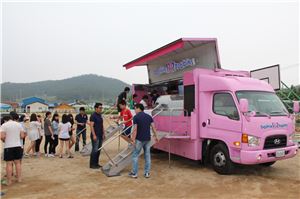 배스킨라빈스 핑크카를 찾은 아이들이 아이스크림을 먹으며 즐거워하고 있다.