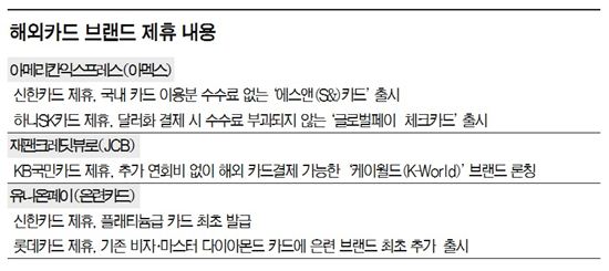 [아시아경제 이현주 기자] 해외카드이용실적에서 압도적인 점유율을 차지하고 있는 비자·마스타카드의 아성에 아메리카익스프레스(아멕스), 재팬크레딧뷰로 인터내셔널(JCB), 유니온페이(은련카드) 등 기타 브랜드들이 도전장을 내밀었다. 국내 카드사와 제휴를 맺고 국내외 사용 수수료를 낮추거나 아예 없앤 카드를 선보이면서 점유율 확대에 나서고 있다.31일 여신금융협회와 카드사에 따르면 아멕스는 이달 초 신한카드와 제휴를 맺고 국내 카드 이용분에 수수료가 없는 '에스앤(S&)' 카드를 출시했다. 해외 브랜드 카드의 경우 국내 사용 수수료가 소비자들에게 연회비 형식으로 청구됐지만 이를 없앤 것이다. 또 아멕스는 최근 하나SK카드와 제휴를 통해 해외에서 미 달러화 결제시 수수료를 부과하지 않는 '글로벌페이 체크카드'를 선보였다. 전월 실적 등의 조건 없이 온라인을 포함해 모든 외국 가맹점 해외이용 수수료가 무료다.JCB도 이달 들어 KB국민카드와 공동으로 추가 연회비 없이 해외에서 카드결제가 가능한 '케이월드(K-World)' 브랜드를 론칭했다. 별도의 국내외겸용카드 발급 없이 국내전용카드 수준의 연회비로 사용 가능한 것이 특징이다.은련카드는 롯데카드와 제휴해 지난달 '유니온페이 다이아몬드카드'를 출시했다. 원래 비자·마스타카드 브랜드만 다이아몬드 카드로 출시했지만 이번에 은련 브랜드가 새롭게 추가된 것이다. 은련은 신한카드와도 다음달에 유니온페이 플래티늄 카드를 출시할 계획이다. 신한 은련카드의 경우 일반 등급 카드 밖에 없었지만 새로운 고객층 확보를 위해 이번에 플래티늄급 카드를 추가적으로 선보이기로 했다.카드업계 관계자는 "비자·마스타카드와 비교해 브랜드 인지도나 영업망 등에서 부족한 점이 있지만 고객들의 비용부담을 줄여주는 서비스 도입 등을 통해 도약을 시도하는 중"이라며 "아멕스, JCB 등 브랜드 카드의 경우 국내 사용 수수료가 없기 때문에 연회비가 낮아지는 형식으로 고객들에게 혜택이 돌아갈 수 있다"고 말했다. 아멕스와 JCB, 은련카드가 국내 카드사들과 제휴를 맺고 고객 확대 전략에 적극 나선 이유는 선두주자인 비자·마스타카드와의 점유율 격차가 계속 커지고 있기 때문이다. 올해 1분기 브랜드사별 해외카드이용실적 비중은 비자가 56.6%, 마스타카드가 29.0%를 기록했다. 1분기 해외카드구매실적(해외현금인출실적 제외)이 20억8000만달러인(한화 2조1300억원) 것을 감안하면 약 10억달러(1조원) 정도가 비자카드를 통해 이뤄진 결제다. 아멕스와 은련카드 등 기타 브랜드의 점유율은 14.4% 수준이다. 2011년 1분기 점유율과 비교해보면 비자는 5.6%포인트, 마스타카드는 2.9%포인트 올랐다. 아멕스와 은련 등 기타 브랜드는 8.4%포인트 가량 줄었다.금융업계 관계자는 "비자와 마스타카드가 국내에서 독과점 체제라고 할 만큼 높은 점유율을 차지하고 있어 기타 브랜드들의 이번 행보가 큰 영향을 미칠 수 있을지는 시간을 갖고 지켜봐야 한다"면서도 "결제 시장이 어떻게 변동 될지 모르기 때문에 국내 사용분 수수료를 낮춘 카드들이 이번에 출시되면 비자와 마스타카드에 자극은 분명히 될 것"이라고 말했다.이현주 기자 ecolhj@asiae.co.kr<ⓒ세계를 보는 창 경제를 보는 눈, 아시아경제(www.asiae.co.kr) 무단전재 배포금지>