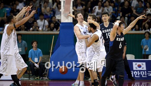 [아시아경제 김현민 기자] 31일 서울 잠실학생체육관에서 열린 남자 농구 국가대표팀과 뉴질랜드의 2차 평가전에서 경기 종료와 함께 역전 버저비터를 성공시킨 뉴질랜드 선수들이 기뻐하고 있다. 결과는 70-71 한국 패.김현민 기자 kimhyun81@asiae.co.kr<ⓒ세계를 보는 창 경제를 보는 눈, 아시아경제(www.asiae.co.kr) 무단전재 배포금지>