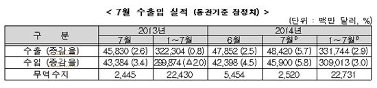 [아시아경제 오현길 기자] 미국과 유럽 등 선진국으로 수출이 호조세를 보이며 30개월 연속 무역수지 흑자를 기록했다. 다만 중국 수출 감소세가 최근 3개월 연속 이어지고 있어 정부가 대책마련에 나선다.1일 산업통상자원부에 따르면 7월 수출은 484억2000만달러로 전년 동월 대비 5.7% 증가했다. 수입은 지난해보다 5.8% 증가한 459억달러를 기록, 무역수지는 25억달러 흑자를 달성했다.미국과 유럽연합(EU), 일본 등 선진국으로 수출이 크게 증가했다. 7월 대미 수출 증가율은 19.4%를 달성했고, 대EU와 대일 수출증가율도 각각 11.5%, 6.0%에 달한다.하지만 대중국 수출은 석유화학(-5.9), 선박(-77.8) 등 주요 품목 수출이 줄어 지난 5월과 6월 각각 9.4%, 1.0% 하락에 이어 7월에도 7.0%나 감소했다.산업부 관계자는 "7월 수출은 선진국 수출 호조로 증가세가 지속됐지만 중국 수출이 3개월 연속 감소세를 보인 것은 우려된다"며 "최근 중국 수출 둔화에 대응해 관계부처 합동으로 관련 대책을 마련할 계획"이라고 말했다.품목별로 무선통신기기와 철강, 자동차가 선전했다. LG전자 G3 해외출시 등에 힘입어 무선통신기기 수출은 전년 대비 24.6% 늘었으며, 자동차 수출은 역시 자동차 업계 휴무변경과 한·EU 자유무역협정(FTA) 추가 관세인하로 20.8% 신장했다.미국과 일본의 시황회복에 따라 철강제품 수출도 22.4%나 증가했다. 이 외에도 액정표시장치(LCD)와 반도체 수출이 각각 7.3%, 1.0% 증가했다. 그러나 글로벌 PC시장 성장 둔화로 컴퓨터 수출은 지난해보다 12.2% 줄었으며, 선박 수출도 13.7% 감소했다.7월 수입은 올 들어 가장 큰 폭으로 증가했다. 원유와 석유제품, 철강, 가스 등 원자재 수입이 지난해보다 8.8% 증가하면서 전체 수입의 61%를 차지했다. 전체 수입의 28%를 차지한 자본재 가운데서는 반도체제조용장비와 자동차부품, 무선통신기기부품 등의 수입이 크게 증가했다.자동차 수입이 꾸준히 증가하면서 소비재 수입증가율도 15.9%를 기록했다. 1500㏄ 초과 가솔린자동차 수입증가율은 17.0%, 2500㏄ 이하 디젤자동차 수입증가율은 24.0%에 달했다.한편 하반기 수출은 선진국의 경기회복세가 확대되는 등에 힘입어 호조세가 지속될 것으로 산업부는 전망했다.세종=오현길 기자 ohk0414@asiae.co.kr<ⓒ세계를 보는 창 경제를 보는 눈, 아시아경제(www.asiae.co.kr) 무단전재 배포금지>