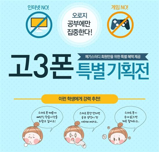 [아시아경제 김영식 기자] SK텔링크가 국내 최대 온라인 교육기업 메가스터디와 제휴해 중학생용 '열공폰', 고등학생용 '고3폰'의 제휴상품을 선보인다. 학생들의 학습환경에 특화된 '피처폰'으로 스마트폰이 야기할 수 있는 다양한 방해요소를 차단해 공부에 집중할 수 있도록 했다. 1일 SK텔링크에 따르면 '열공폰'은 '미니멀폴더' 단말기가 제공되며 기본 제공량은 음성 50분, 문자 150건으로 문자 사용이 많은 학생들에게 최적화됐다. 2년 약정시 월 기본료는 1만7270원으로 저렴하다.'고3폰'은 복잡하고 불필요한 기능은 빼고 휴대폰 기능에 충실한 '제로폰' 단말기를 지원하며 1년간 월 기본료 5500원에 이용할 수 있어 수험생들이 합리적으로 사용할 수 있다.이달 28일까지 가입하면 가입비와 유심비가 면제되며, 메가스터디와 엠베스트 온라인 강의를 수강할 수 있는 캐쉬와 서비스 이용권, 티머니(T-money) 교통카드, 기프티콘 등 다양한 부가 혜택이 주어진다.고등학생은 메가스터디 홈페이지, 중학생은 엠베스트 홈페이지를 통해 가입할 수 있으며 자세한 문의사항은 SK텔링크 고객센터(1599-8277)에서 가능하다.송재근 SK텔링크 MVNO사업본부장은 "메가스터디 알뜰폰 제휴상품은 저렴하고 휴대폰 본연의 기능에 충실한 서비스로 구성돼 공부에 전념하고자 하는 청소년들에게 적합하다"면서 "본격적인 여름 방학 시즌을 맞아 메가스터디와 엠베스트를 이용하는 많은 중고등학생들에게 유용할 것"이라고 말했다. 김영식 기자 grad@asiae.co.kr<ⓒ세계를 보는 창 경제를 보는 눈, 아시아경제(www.asiae.co.kr) 무단전재 배포금지>