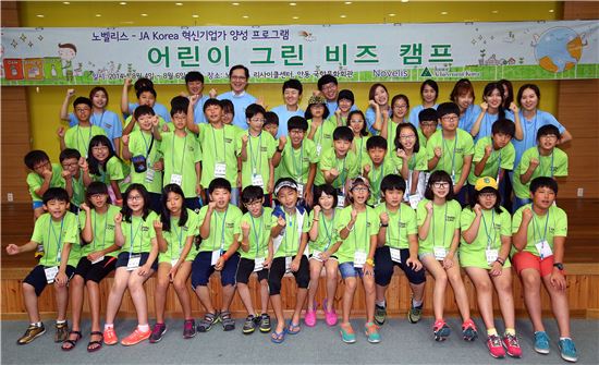 노벨리스코리아가 4일부터 6일까지 개최하는 그린비즈 캠프에 참가한 어린이들이 기념촬영을 하고 있다. 노벨리스코리아