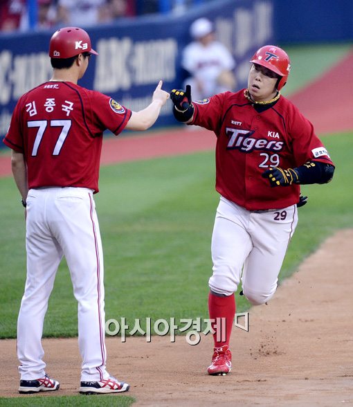 아시아경제 김현민 기자] 5일 서울 잠실구장에서 열린 프로야구 KIA 타이거즈와 두산 베어스의 경기, KIA 나지완이 2회초 선두타자로 나서 선제 솔로홈런을 치고 김종국 코치와 세리머니하고 있다. 김현민 기자 kimhyun81@asiae.co.kr<ⓒ세계를 보는 창 경제를 보는 눈, 아시아경제(www.asiae.co.kr) 무단전재 배포금지>