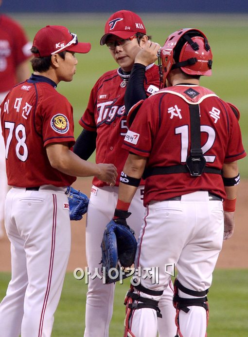 [아시아경제 김현민 기자] 5일 서울 잠실구장에서 열린 프로야구 KIA 타이거즈와 두산 베어스의 경기, 2회말 연속 안타를 허용하며 역전을 허용한 양현종이 마운드에 올라온 이대진 코치와 이야기를 나누고 있다. 김현민 기자 kimhyun81@asiae.co.kr<ⓒ세계를 보는 창 경제를 보는 눈, 아시아경제(www.asiae.co.kr) 무단전재 배포금지>