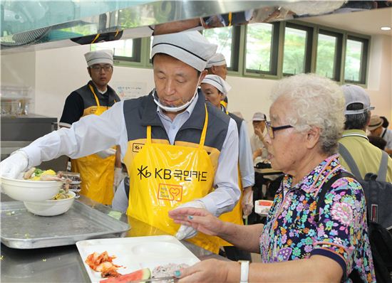 ▲김덕수 KB국민카드 사장이 8월 6일 오전 서울시립서대문노인종합복지관에서 진행된 '말복맞이 어르신 사랑나눔잔치'에서 복지관 인근 거주 어르신들에게 삼계탕 등 말복맞이 보양식을 제공하고 있다.