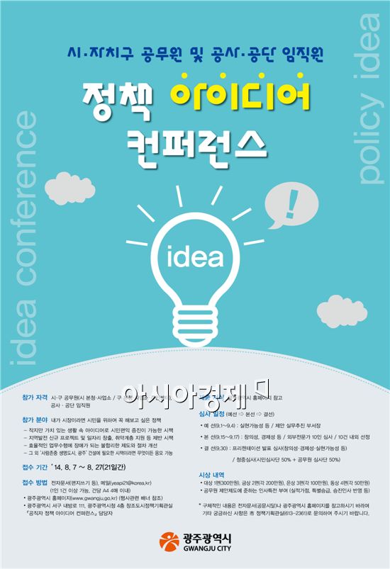 “사람존중 생명도시, 광주’ 건설 아이디어 찾아요”“9월30일, 시·자치구 공무원 등 대상”[아시아경제 노해섭 기자]광주광역시는 공무원의 미래지향적이고 창의적인 정책아이디어 개발을 위해 오는 9월30일 민선6기 ‘사람존중 생명도시, 광주’ 실현을 위한 ‘공직자 정책 아이디어 컨퍼런스’를 개최한다고 밝혔다. ‘공직자 정책 아이디어 컨퍼런스’ 응모에는 광주시와 자치구 공무원, 시 산하 공사·공단 임직원 누구나 참여할 수 있다. 아이디어는 △작지만 가치있는 생활 속 아이디어로 시민편익 증진이 가능한 시책 △지역발전 신규 프로젝트 및 일자리 창출, 취약계층 지원 등 제반 시책 등 ‘사람존중 생명도시, 광주’ 건설에 필요한 시책이면 된다.제출서식은 시 홈페이지(누리집 www.gwangju.go.kr/부서바로가기/기획조정실/창조도시정책관)에서 내려받아 작성한 후 우편이나 이메일(전자우편 yeapi21@korea.kr)으로 접수하면 된다.접수기간은 7일부터 27일까지이며, 접수된 아이디어를 대상으로 해당 실·과에서 실현가능성을 중심으로 1차 예비심사를 하고, 이후 교수와 시의원, 시민단체대표 등 외부전문가 10명으로 구성된 심사단이 본선 심사를 진행, 창의성과 효과성이 높은 아이디어 10건을 결선에 최종 진출시키게 된다.결선에서는 시민 100명과 공무원 100명 등 총 200명으로 구성된 청중심사단이 제안자들의 프레젠테이션에 대해 심사해 점수 합산 결과에 따라 대상 1편, 금상 2편, 은상 3편, 동상 4편 등을 결정할 계획이다.수상자에게는 대상 300만원, 금상 각 200만원, 은상 각 100만원, 동상 각 50만원을 수여하고, 선정된 아이디어가 실제 정책에 반영될 경우 제안자에게 실적 가점, 특별 승급, 승진 등 공무원 제안 제도에 준하는 인사특전도 부여한다.시 관계자는 “공무원들은 누구나 업무를 하다 보면 만일 내가 시장이라면 꼭 해보고 싶은 정책이 하나 둘 있게 마련이다”며 “이번 컨퍼런스는 그런 아이디어를 발굴해 정책으로 연결하는 만큼 실현 가능성 있는 정책들이 많이 나올 것으로 기대된다”고 말했다.우편 접수처 : 광주광역시 서구 내방로 111, 광주광역시청 4층 창조도시정책기획관실 ‘공직자 정책 아이디어 컨퍼런스’ 담당자노해섭 기자 nogary@<ⓒ세계를 보는 창 경제를 보는 눈, 아시아경제(www.asiae.co.kr) 무단전재 배포금지>