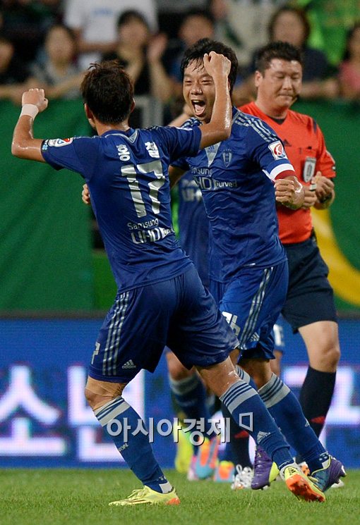 [전주=아시아경제 김현민 기자] 6일 전주월드컵경기장에서 열린 프로축구 'K리그 클래식 2014' 전북 현대와 수원 삼성의 경기에서 수원 염기훈이 프리킥 동점골을 성공시키고 환호하고 있다.김현민 기자 kimhyun81@asiae.co.kr<ⓒ세계를 보는 창 경제를 보는 눈, 아시아경제(www.asiae.co.kr) 무단전재 배포금지>