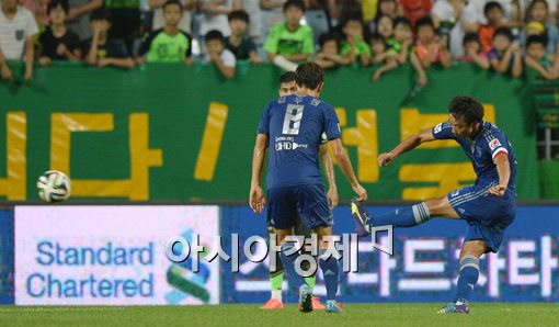 [전주=아시아경제 김현민 기자] 6일 전주월드컵경기장에서 열린 프로축구 'K리그 클래식 2014' 전북 현대와 수원 삼성의 경기에서 수원 염기훈이 프리킥 동점골을 성공시키고 있다.김현민 기자 kimhyun81@asiae.co.kr<ⓒ세계를 보는 창 경제를 보는 눈, 아시아경제(www.asiae.co.kr) 무단전재 배포금지>