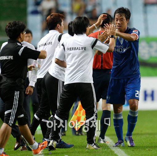 [전주=아시아경제 김현민 기자] 6일 전주월드컵경기장에서 열린 프로축구 'K리그 클래식 2014' 전북 현대와 수원 삼성의 경기에서 수원 염기훈이 프리킥 동점골을 성공시키고 코칭스텝과 하이파이브하고 있다.김현민 기자 kimhyun81@asiae.co.kr<ⓒ세계를 보는 창 경제를 보는 눈, 아시아경제(www.asiae.co.kr) 무단전재 배포금지>