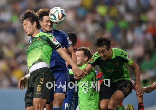 [전주=아시아경제 김현민 기자] 6일 전주월드컵경기장에서 열린 프로축구 'K리그 클래식 2014' 전북 현대와 수원 삼성의 경기에서 전북 최보경과 수원 김은선이 공중볼을 다투고 있다.김현민 기자 kimhyun81@asiae.co.kr<ⓒ세계를 보는 창 경제를 보는 눈, 아시아경제(www.asiae.co.kr) 무단전재 배포금지>