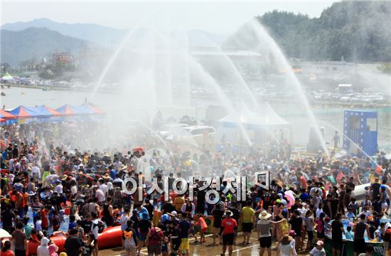 “오는 10일까지 연장, 관광객들에게 최상의 서비스 제공”"공무원, 군민 등 약2,500여명 자발적 참여로 태풍피해 긴급 복구"[아시아경제 노해섭 기자]정남진 장흥 물축제가 개최되고 있는 탐진강에서 군민들의 애틋한 감동의 축제 파노라마가 펼쳐지고 있다.지난 1일부터 7일까지 7일간 ‘물과 숲 -휴식’이라는 주제로 펼쳐지는 물축제에서 군민자원봉사자, 공무원 등 2,000여명이 함께 참여해 만들어가는 지상최대 물싸움, 맨손물고기잡기, 천연약초 힐링풀 등 60여종의 체험프로그램들이 성황리에 펼쳐지고 있는 것이 그 하나다는 것.지난 2일 태풍 폭우로 축제장인 탐진강이 범람해 침수되는 피해로 축제의 취소 위기까지 왔으나 3일 공무원, 자원봉사자, 민간단체 등 약2,500여명 군민들의 자발적 참여로 축제장을 복구해 4일부터 축제가 계속되게 하는 또 하나의 감동적인 축제 파노라마가 펼쳐졌다.태풍 나크리의 영향으로 장흥 물축제장이 범람하자 공무원, 군민 등 2500여명이 참여해 축제 행사장을 긴급복구 했다.