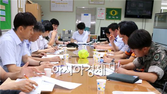 광주광역시 동구(청장 노희용)는 7일 소태역에서 동구청, 동부경찰서, 동부소방서, 31사단, 503여단, 도시철도공사, 동구보건소 등이 참여한 가운데 2014 을지연습 실제훈련 대비 유관기관 회의를 개최하고 훈련 준비사항 등을 점검했다. 사진제공=광주시 동구<br />