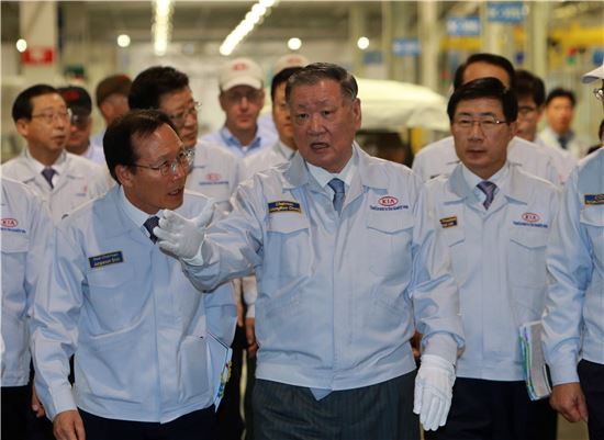 정몽구 현대차그룹 회장(사진 앞줄 가운데)이 7일(현지시간) 기아차 조지아공장을 둘러보며 현지 직원들과 의견을 나누고 있는 모습.
