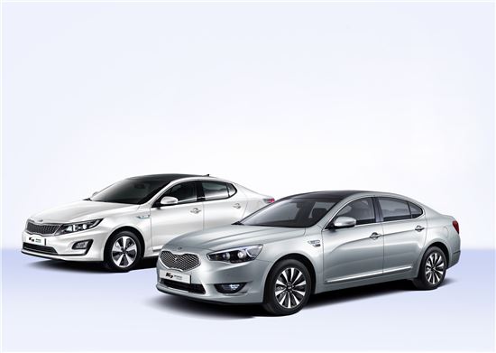 기아자동차 하이브리드 친환경 이벤트. 사진 왼쪽부터 K5 하이브리드 500h, K7 하이브리드 700h.<br /> <br />