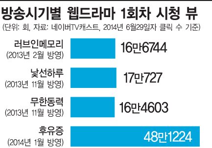 [아시아경제 심나영 기자]10~15분 짜리 드라마에 이용자들의 반응이 뜨겁다. 롱텀에볼루션(LTE) 서비스가 대중된 후 동영상 이용률이 늘어나면서 '웹 드라마'라는 신종 장르가 뜨고 있다. 적게는 10만, 많게는 50만명에 이르는 이용자들이 특정 웹드라마를 시청했다. 모바일이 새로운 소통문화를 이끌면서 콘텐츠 역시 이 트렌드에 올라타는 분위기이다.웹 드라마란 TV나 인터넷 또는 스마트폰을 통해 시청하는 드라마를 일컫는다. 주로 네이버TV캐스트나 다음 스토리볼을 통해 방송되며 일명 'SNS 드라마'라고도 불린다. 스마트폰에서 시청하기 편리하도록 10~15분 정도의 짧은 분량으로 제작된다. 8일 KT경제경영연구소가 발표한 '웹 드라마의 부상과 모바일 콘텐츠로서의 가치' 보고서(저자 정지윤)에 따르면 웹 드라마는 다양한 소재의 웹툰을 영상화해 10~30대 사이에서 인기를 모으고 있다. 기존 TV드라마에서 다루지 않았던 초능력, 뱀파이어, 먹방 등 '신선한 소재'를 활용하고 아이돌 중심의 배우를 캐스팅한 덕분이다. 올해 닐슨 조사를 보면 3월 기준 모바일 화면 시청시간은 10대 3시간 49분, 20대 5시가 16분, 30대 3시간 48분을 나타났다. 실제 웹 드라마의 인지도가 향상됨에 따라 시청뷰(view)도 증가하고 있다. 네이버TV캐스트가 조사한 1회차 시청뷰(6월 29일자 클릭수 기준) 따르면 지난해 2월 방영된 '러브인메모리'는 16만6744회에서 같은해 11월 나온 '낯선하루'는 17만727회, 올해 1월에 선보인 '후유증'은 48만1224회까지 기록했다. 보고서는 "2017년까지 전체 모바일 트래픽 중 영상 트래픽이 약 74%를 차지할 것으로 예상된다"며 "LTE 서비스 보급에 따라 모바일 소비 콘텐츠가 텍스트와 이미지에서 동영상으로 변화하고 있는데, 웹 드라마는 웹툰에 이어 새롭게 등장한 모바일 콘텐츠 장르"라고 설명했다. 기업들에게는 웹 드라마가 새로운 간접광고 방안으로 떠올랐다. 보고서는 "기존 TV드라마 대비 6분의 1까지 저렴한 제작비로 인해, 기업이 직접 제작에 참여하는 방식으로 보다 적극적인 간접광고를 하고 있다"며 "소비자에게 자연스럽게 기업 이미지를 전달할 수 있으며, 기업 블로그와 SNS를 통해서도 방송해 소비자가 기업의 SNS로 직접 찾아오게 만들 수 있다"고 설명했다. 실제 웹드라마 중에서 '러브인메모리'는 교보생명이, '무한동력'은 삼성그룹이, '매콤한 인생'은 죠스떡볶이가 제작했다. 심나영 기자 sny@asiae.co.kr<ⓒ세계를 보는 창 경제를 보는 눈, 아시아경제(www.asiae.co.kr) 무단전재 배포금지>