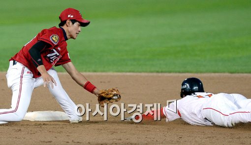 [인천=아시아경제 김현민 기자] 8일 인천 문학구장에서 열린 프로야구 KIA 타이거즈와 SK 와이번스의 경기, 5회말 1사 1루에서 KIA 유격수 강한울이 2루 도루를 시도한 SK 임훈을 태그아웃시키고 있다.김현민 기자 kimhyun81@asiae.co.kr<ⓒ세계를 보는 창 경제를 보는 눈, 아시아경제(www.asiae.co.kr) 무단전재 배포금지>