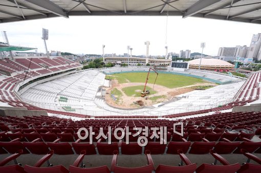 [수원=아시아경제 김현민 기자] 프로야구 신생팀 kt위즈의 홈구장으로 사용될 수원야구장이 1일 공정율 85%를 보이며 공사가 진행중이다. 이철 리모델링 공사 현장소장은 오는 10월 말이면 120만 수원시민들을 위한 새 야구장이 완공될 것이라고 밝혔다.김현민 기자 kimhyun81@asiae.co.kr<ⓒ세계를 보는 창 경제를 보는 눈, 아시아경제(www.asiae.co.kr) 무단전재 배포금지>