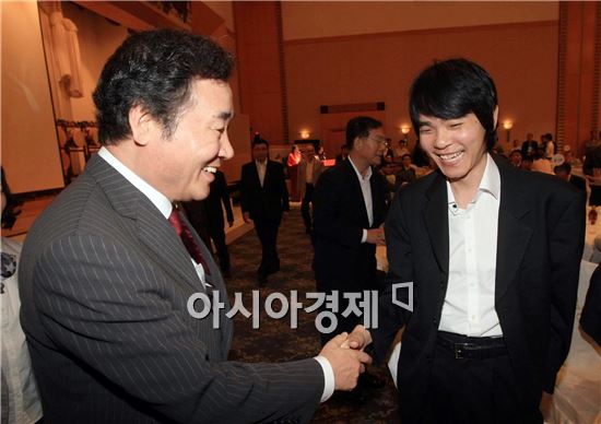 이낙연 전남지사가 8일 오후 영암군 삼호읍 현대호텔에서 열린 ‘2014 국수산맥 국제바둑대회 개막식’에 참석 이세돌 9단(國手)과 인사를 하고 있다. 국수산맥 국제바둑대회는 한ㆍ중 단체바둑 대항전과 국제 페어바둑대회, 국제 어린이바둑대회 등 3개 부분으로 나뉘어 열린다. 사진제공=전남도