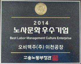 ▲ 오비맥주 이천공장 노사문화 우수기업 인증패.