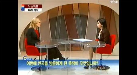CNN 앵커 안나 코렌과 영어로 대화 중인 김희경 아나운서(사진=MBN 캡처)