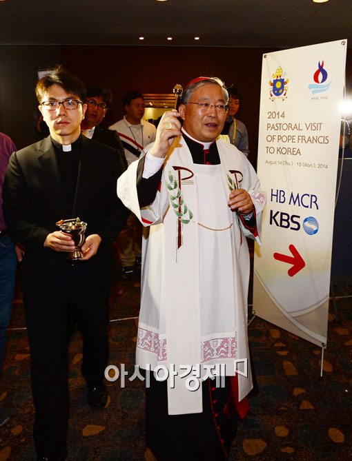 서울 중구 롯데호텔에서 열린 메인 프레스센터 축복식에서 염수정 추기경(오른쪽)이 성수를 뿌리며 축복하고 있다. 사진=백소아 기자 sharp2046@asiae.co.kr<br />