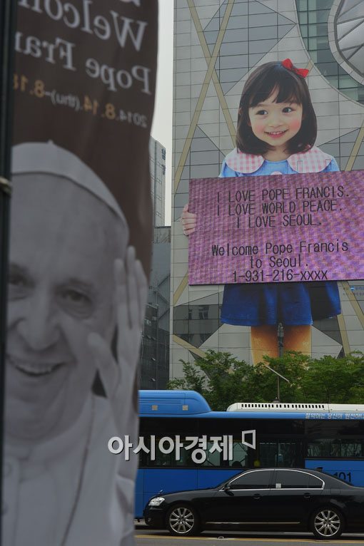 [아시아경제 백소아 기자] 프란치스코 교황 방한을 하루 앞둔 13일 서울 태평로 도로 주변에 교황의 방한을 환영하는 현수막 뒤로 서울 시민들이 보낸 환영 메시지들이 보이고 있다.백소아 기자 sharp2046@asiae.co.kr<ⓒ세계를 보는 창 경제를 보는 눈, 아시아경제(www.asiae.co.kr) 무단전재 배포금지>