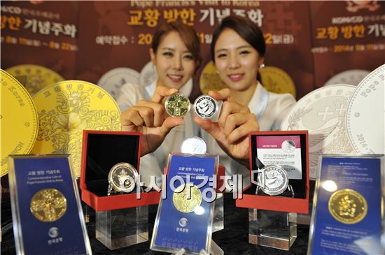 한국조폐공사는 프란치스코 교황 방한 기념주화 예약 접수가 시작됐다고 13일 발표했다. 기념주화 예약 접수는 11일 시작돼 22일까지 전국 우리은행과 농협은행 창구 2000여곳에서 진행되며, 우리은행 홈페이지(www.wooribank.com)를 통해서도 접수할 수 있다. 기념주화는 은화와 황동화 1종씩 두 종류로 발행되며, 종류별 최대 발행량은 은화 3만장(국내 2만7000장, 국외 3,000장), 황동화 6만장(국내 5만4000장, 국외 6000장) 등이다. 기념주화 판매 가격은 은화 6만원, 황동화 1만4500원으로 1인당 신청 한도는 종류별로 최대 3장이다. 예약 접수량이 국내 발행량을 넘어서면 추첨으로 구매자를 정한다. 기념주화 배부일은 오는 10월 13일이다. 박연미 기자 change@asiae.co.kr<ⓒ세계를 보는 창 경제를 보는 눈, 아시아경제(www.asiae.co.kr) 무단전재 배포금지>