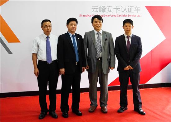 SK엔카 중국 상하이 홍커우 중고차 판매 1호점 개점식에서 박성철 SK엔카 대표(사진 오른쪽 두번째)와 짱요쉐 운봉그룹 총경리(왼쪽 두번째)가 기념 촬영을 하는 모습.