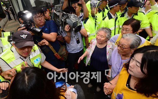 [아시아경제 백소아 기자] 광복절을 이틀 앞둔 13일 서울 종로구 주한일본대사관 앞에서 열린 제2차 세계 일본군 '위안부' 기림일 세계연대집회 (1139차 수요시위)에서 김복동, 길원옥 할머니가 세계 일억인 서명을 대사관측에 전달하기 위해 이동하고 있다.백소아 기자 sharp2046@asiae.co.kr<ⓒ세계를 보는 창 경제를 보는 눈, 아시아경제(www.asiae.co.kr) 무단전재 배포금지>