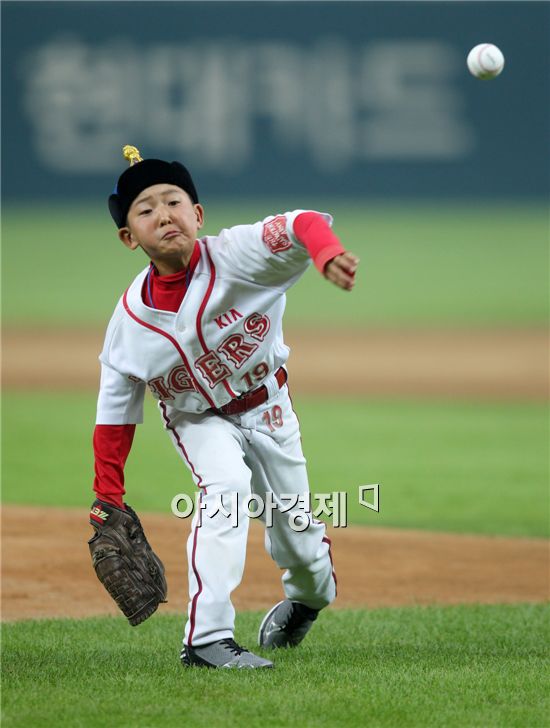 야구동아리 투수 돌고스렌 테물렝(12) 군이 몽골 전통모자를 쓰고 시구를 하고있다. 사진제공=KIA