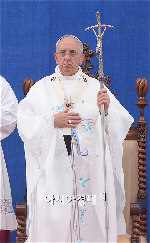 [대전=사진공동취재단] 프란치스코 교황이 15일 대전월드컵경기장에서 열린 '성모승천대축일미사'에서 미사를 집전하고 있다.윤동주 기자 doso7@asiae.co.kr<ⓒ세계를 보는 창 경제를 보는 눈, 아시아경제(www.asiae.co.kr) 무단전재 배포금지>