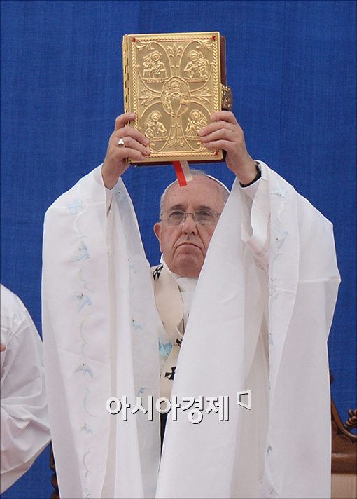 [대전=사진공동취재단] 프란치스코 교황이 15일 대전월드컵경기장에서 열린 '성모승천대축일미사'에서 미사를 집전하고 있다.윤동주 기자 doso7@asiae.co.kr<ⓒ세계를 보는 창 경제를 보는 눈, 아시아경제(www.asiae.co.kr) 무단전재 배포금지>