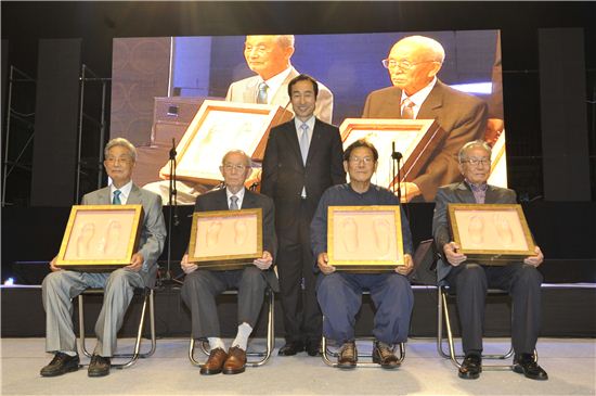 15일 오후 서대문형무소역사관에서 열린 '2014 서대문독립민주축제'에서 서상교 지사, 이태원 지사, 오충일 목사, 박중기 선생(사진 왼쪽부터)이 풋프린팅 후 기념촬영을 하고 있다. 뒤에 서 있는 이는 문석진 서대문구청장.<br />