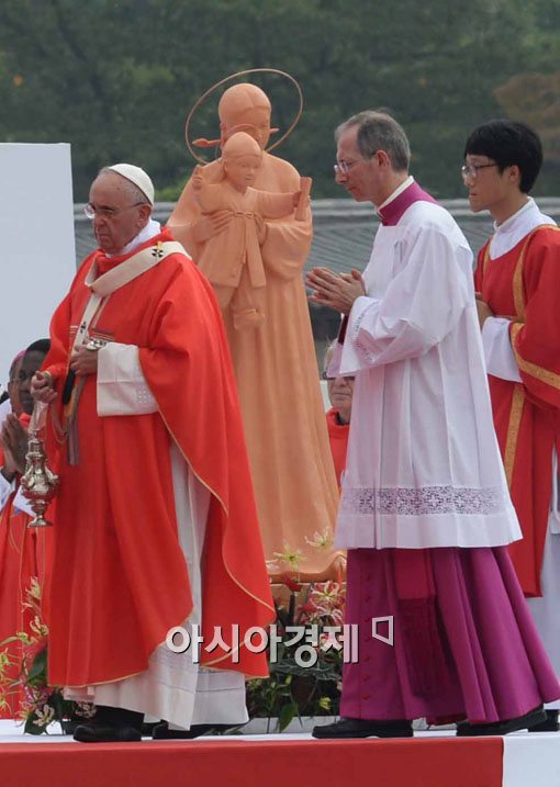 [사진공동취재단] 프란치스코 교황이 16일 오전 서울 광화문광장에서 ‘윤지충 바오로와 동료 순교자 123위’ 시복미사를 집전하고 있다.백소아 기자 sharp2046@asiae.co.kr<ⓒ세계를 보는 창 경제를 보는 눈, 아시아경제(www.asiae.co.kr) 무단전재 배포금지>
