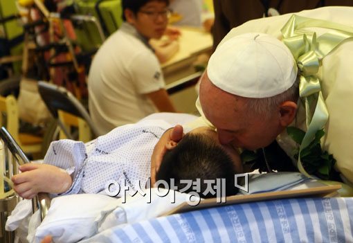 [사진공동취재단] 프란치스코 교황이 16일 음성군 맹동면 꽃동네 희망의 집에서 오미현 양의 이마에 키스를 하고 있다.백소아 기자 sharp2046@asiae.co.kr<ⓒ세계를 보는 창 경제를 보는 눈, 아시아경제(www.asiae.co.kr) 무단전재 배포금지>