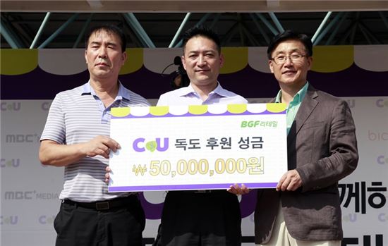 CU는 지난 15일 유관순열사 기념관에서 자전거 국토대장정 해단식과 함께 독도사랑 후원금 전달식을 가졌다. BGF리테일 박재구 사장(오른쪽), 독도사랑운동본부 전일재 사무총장(가운데), CU두정명동점 윤병탁 점주(왼쪽)