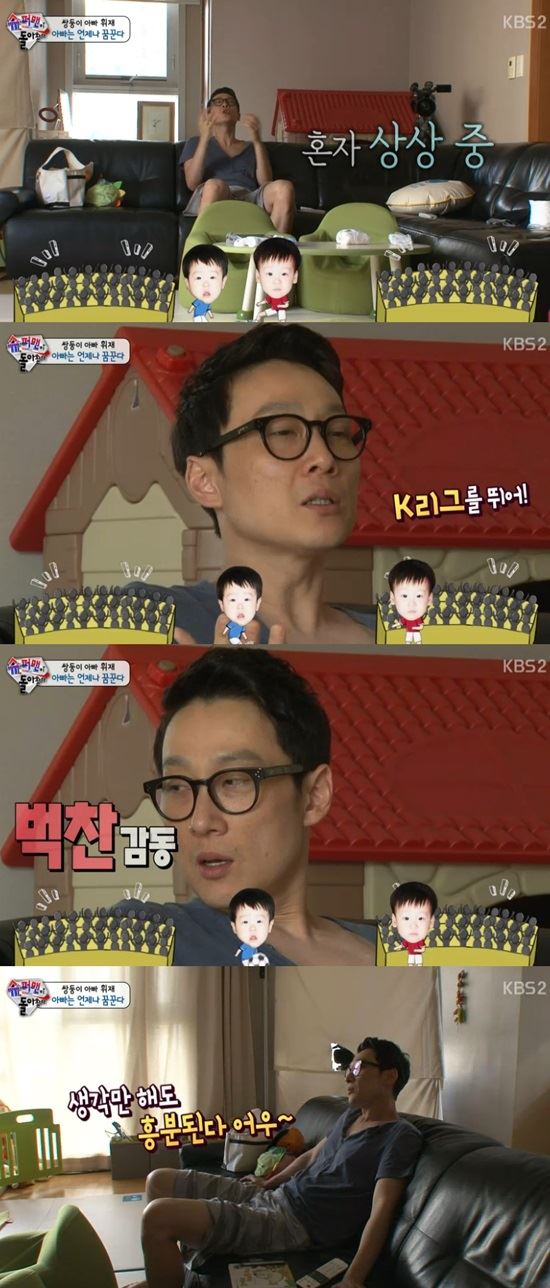 [아시아경제 장용준 기자]개그맨 이휘재가 17일 오후 방송한 KBS2 예능프로그램 '해피선데이-슈퍼맨이 돌아왔다'에서 쌍둥이를 축구선수로 키우려는 야심을 내비쳤다.이날 이휘재는 잘 알려진 축구팬다운 모습을 보였다. 그는 축구선수가 된 자식들을 상상했다. 그는 이내 "바라지도 않는다"는 말로 망상에 대한 민망함을 표현했다.이휘재는 또 쌍둥이들과 'K리그 올스타전' 축구 경기를 관람하기로 결정했다. 그는 선수 대기실에서 아이들의 옷에 차두리 선수의 사인을 받았다.이휘재는 이와 함께 겹쌍둥이 아빠인 이동국 선수에게 자식들을 인사시켰다. 그는 이동국을 "원조 쌍둥이 아빠"라고 소개해 웃음을 자아냈다. 장용준 기자 zelra@asiae.co.kr<ⓒ세계를 보는 창 경제를 보는 눈, 아시아경제(www.asiae.co.kr) 무단전재 배포금지>