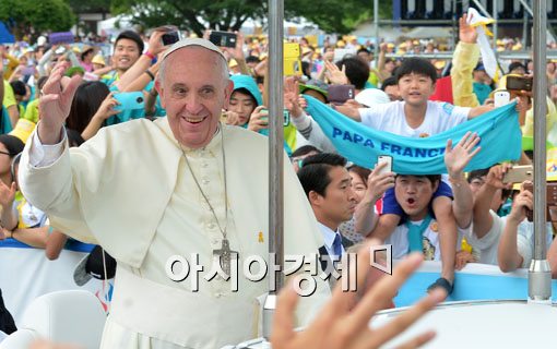 [사진공동취재단] 프란치스코 교황이 방한 나흘째인 17일 충남 서산시 해미읍성을 찾아 아시아 청년대회 폐막미사를 집전하기위해 입장하며 신자들과 시민들에게 손을 들어 인사하고 있다.백소아 기자 sharp2046@asiae.co.kr<ⓒ세계를 보는 창 경제를 보는 눈, 아시아경제(www.asiae.co.kr) 무단전재 배포금지>