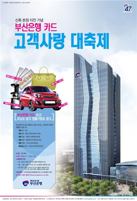 [아시아경제 조은임 기자] 부산은행은 신축 본점 이전을 기념해 오는 11월30일까지 '부산은행 카드 고객 사랑 대축제'를 실시한다고 19일 밝혔다. 부산은행 신용카드·체크카드 이용 회원으로 이벤트에 응모한 고객 중 추첨을 통해 총 470명에게 자동차 및 명품 가방 등 경품을 제공한다. 이벤트 응모는 부산은행 전국 영업점과 홈페이지, 고객센터 ARS를 통해 가능하다.추첨 대상은 응모한 회원의 8월부터 11월까지 4개월 간 부산은행 카드 이용실적에 따라 정해진다. 1등 자동차(경차)는 300만원 이상 이용 회원 중 1명을 추첨한다. 2등 명품가방과 3등 백화점 상품권은 200만원 이상 이용 회원 중 각각 2명, 10명을 추첨해 제공한다. 조은임 기자 goodnim@asiae.co.kr<ⓒ세계를 보는 창 경제를 보는 눈, 아시아경제(www.asiae.co.kr) 무단전재 배포금지>