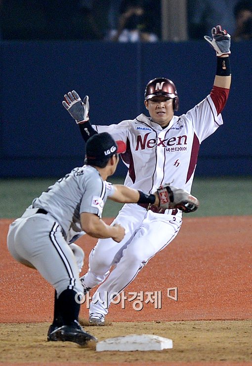 [아시아경제 김현민 기자] 19일 서울 목동구장에서 열린 프로야구 LG 트윈스와 넥센 히어로즈의 경기, 3회말 1사 1,2루에서 넥센 이성열의 2루수 앞 땅볼 때 1루주자 김민성이 2루에서 포스아웃되고 있다. LG 유격수는 오지환.김현민 기자 kimhyun81@asiae.co.kr<ⓒ세계를 보는 창 경제를 보는 눈, 아시아경제(www.asiae.co.kr) 무단전재 배포금지>