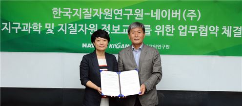 20일 경기 성남 네이버 사옥에서 네이버 한성숙 서비스1본부장(왼쪽)과 한국지질자원연구원 이희일 선임연구본부장이 지구과학 및 지질자원 정보교환을 위한 업무협약을 맺고 기념촬영을 하고 있다.