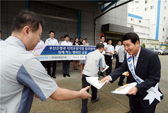 성세환 BS금융그룹 회장(사진 오른쪽)이 21일 부산시 사상시 삼락동 한미유압기계를 방문해 임직원에게 금융서비스를 제공하는 '생생데이' 행사를 진행하고 있다.(자료제공:부산은행)